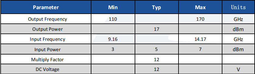 After frequency multiplication within the 110-170GHz range, the typical output power reaches +17dBm.