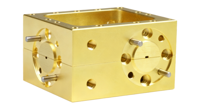 下图为140-220 GHz四端口双向耦合器。四端口双向耦合器可在18-500GHz的整个波导频段内提供多频段、多耦合度的选择且都具备优异的方向性。