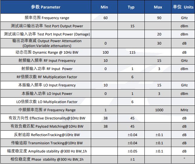 输出功率高,频率范围可扩展至55-95GHz,程控调节范围大;