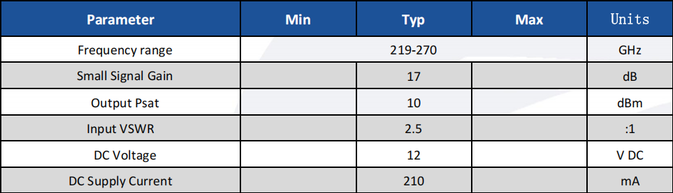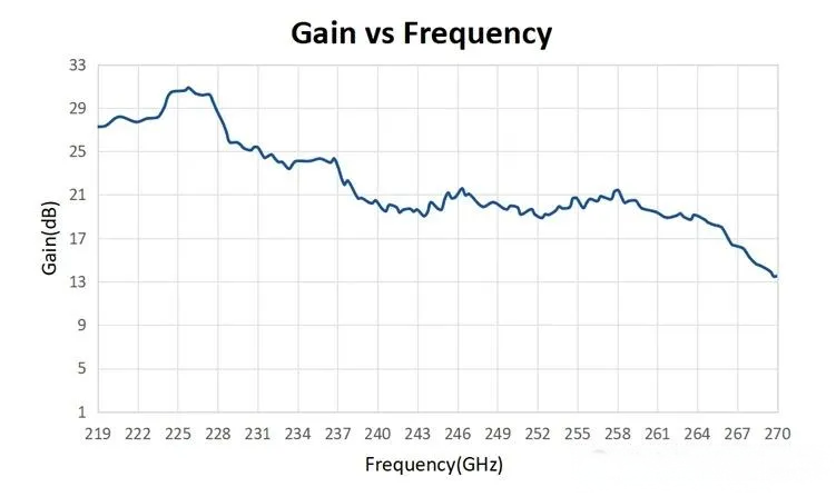 The 219–270 GHz power amplifier is characterized by its high operating frequency and broad bandwidth, making it a capable solution for advanced terahertz applications.